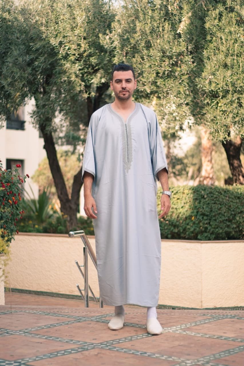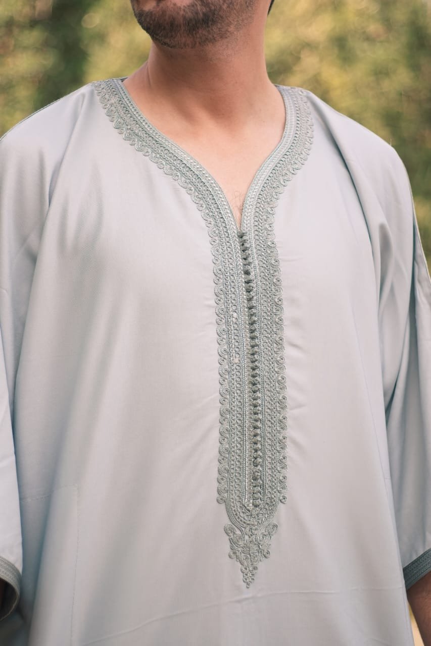 This Light Grey Embroidered Men’s Thobe offers a modern twist on traditional Islamic wear. The subtle grey tone paired with fine embroidery along the neckline creates a refined and stylish appearance.